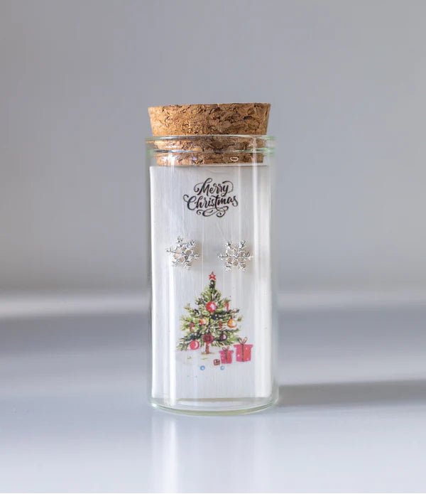 925 Sterling Silver 'Snowflake' studs in a glass bottle with Christmas Tree artwork & Merry Christmas written on the card.