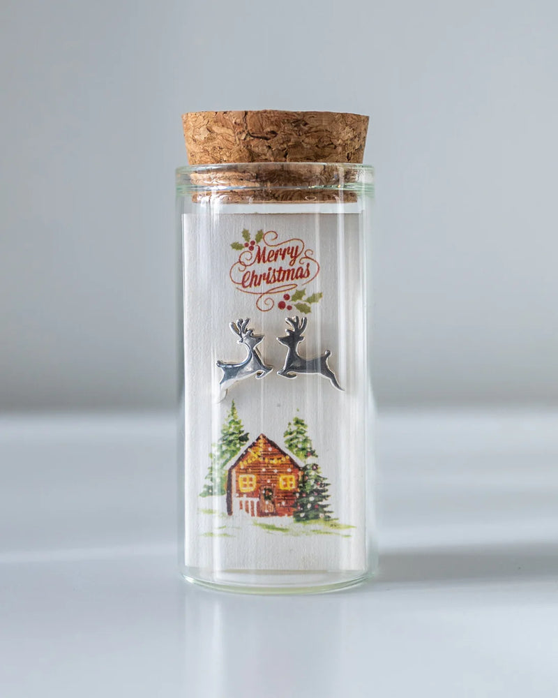 925 Sterling Silver 'Reindeer' studs in a glass bottle with Christmas Tree artwork & Merry Christmas written on the card.