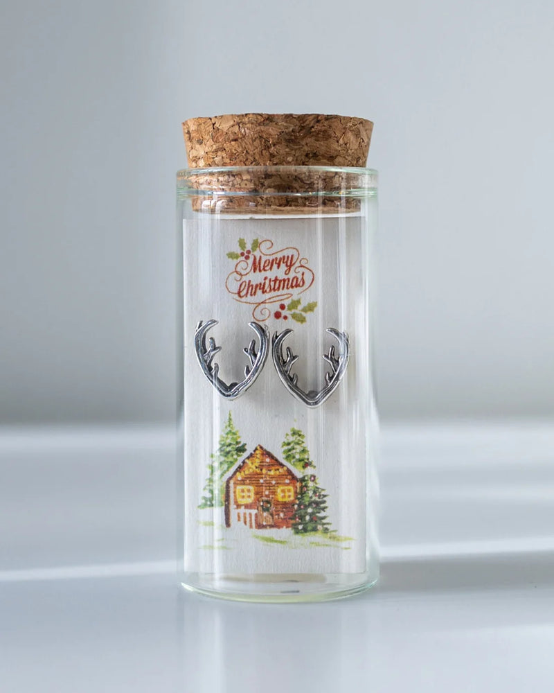 925 Sterling Silver 'Reindeer Antler' studs in a glass bottle with Christmas Tree artwork & Merry Christmas written on the card.