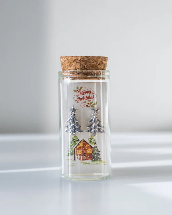 925 Sterling Silver 'Christmas Tree' studs in a glass bottle with Christmas Tree artwork & Merry Christmas written on the card.