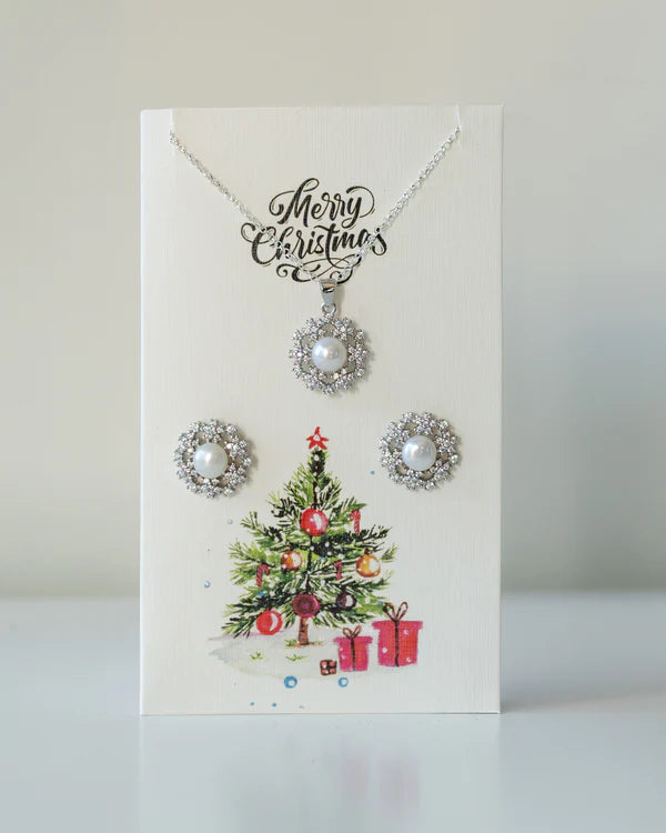 925 Sterling Silver Christmas Pearl Necklace set with Christmas Tree artwork & Merry Christmas written on the card.