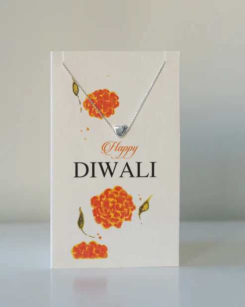 925 Sterling Silver Heart pendant on a Happy Diwali card with marigold artwork.