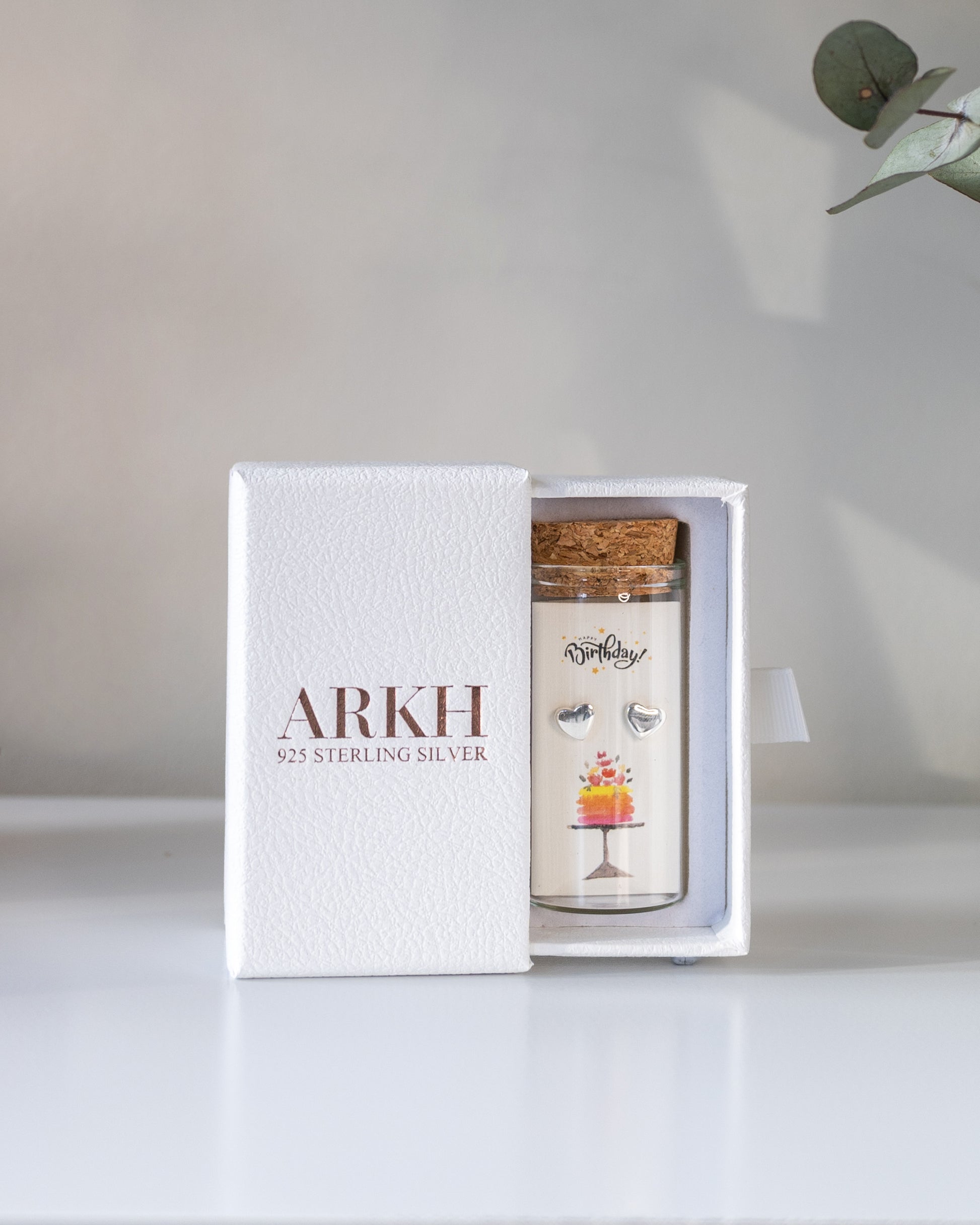 925 sterling silver studs presented as a message-in-a-bottle. The card reads "Happy Birthday!" and features an original illustrated design. Delivered as a complete keepsake set of bottle, card, and jewellery.