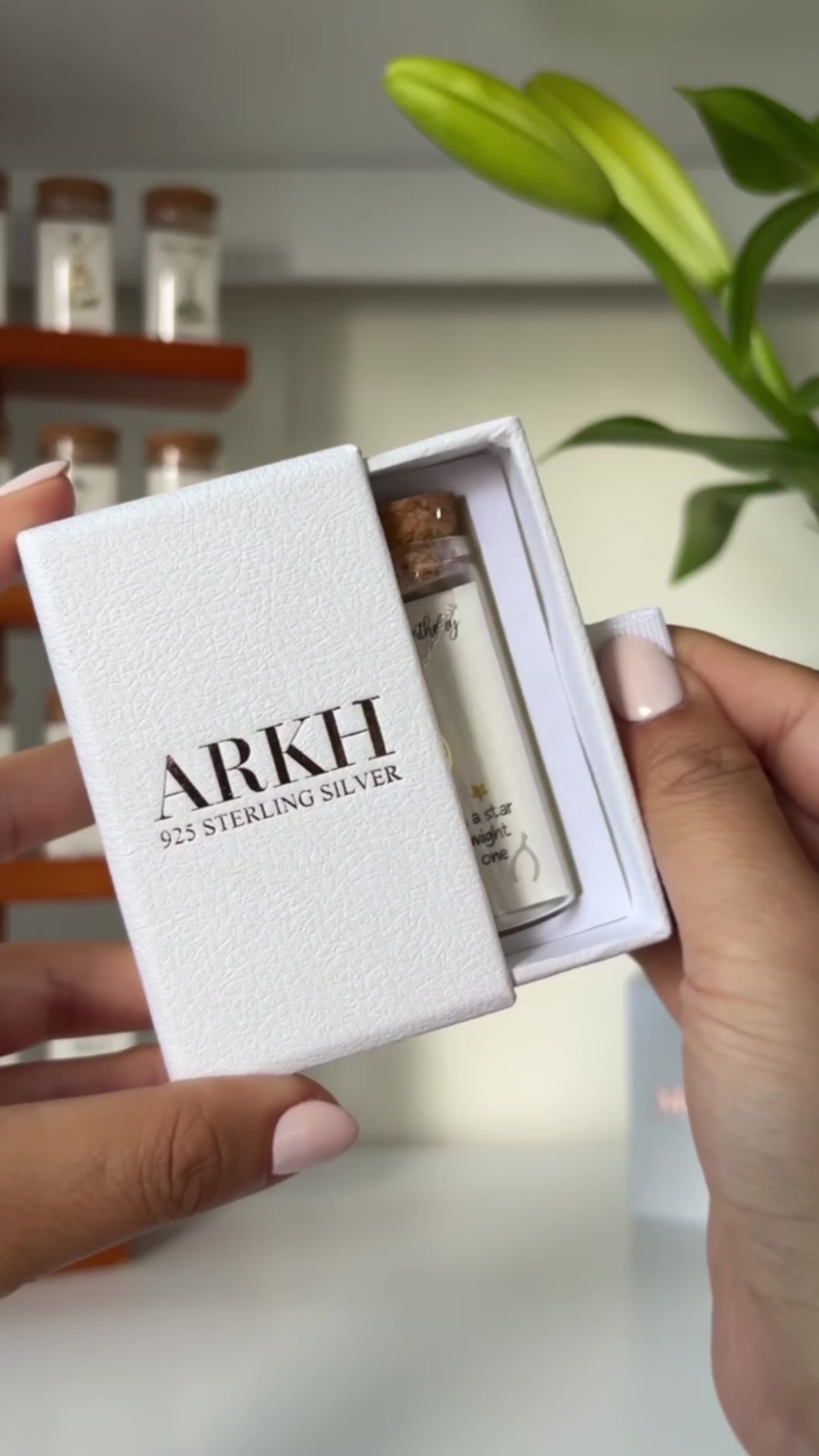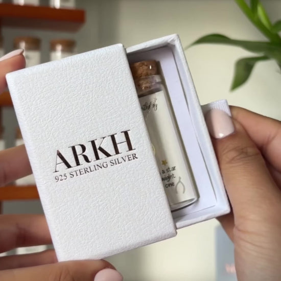 925 sterling silver necklace presented as a message-in-a-bottle. The card reads "Happy Birthday — Wish upon a star and you might become one” and features an original illustrated design. Delivered as a complete keepsake set of bottle, card, and jewellery.