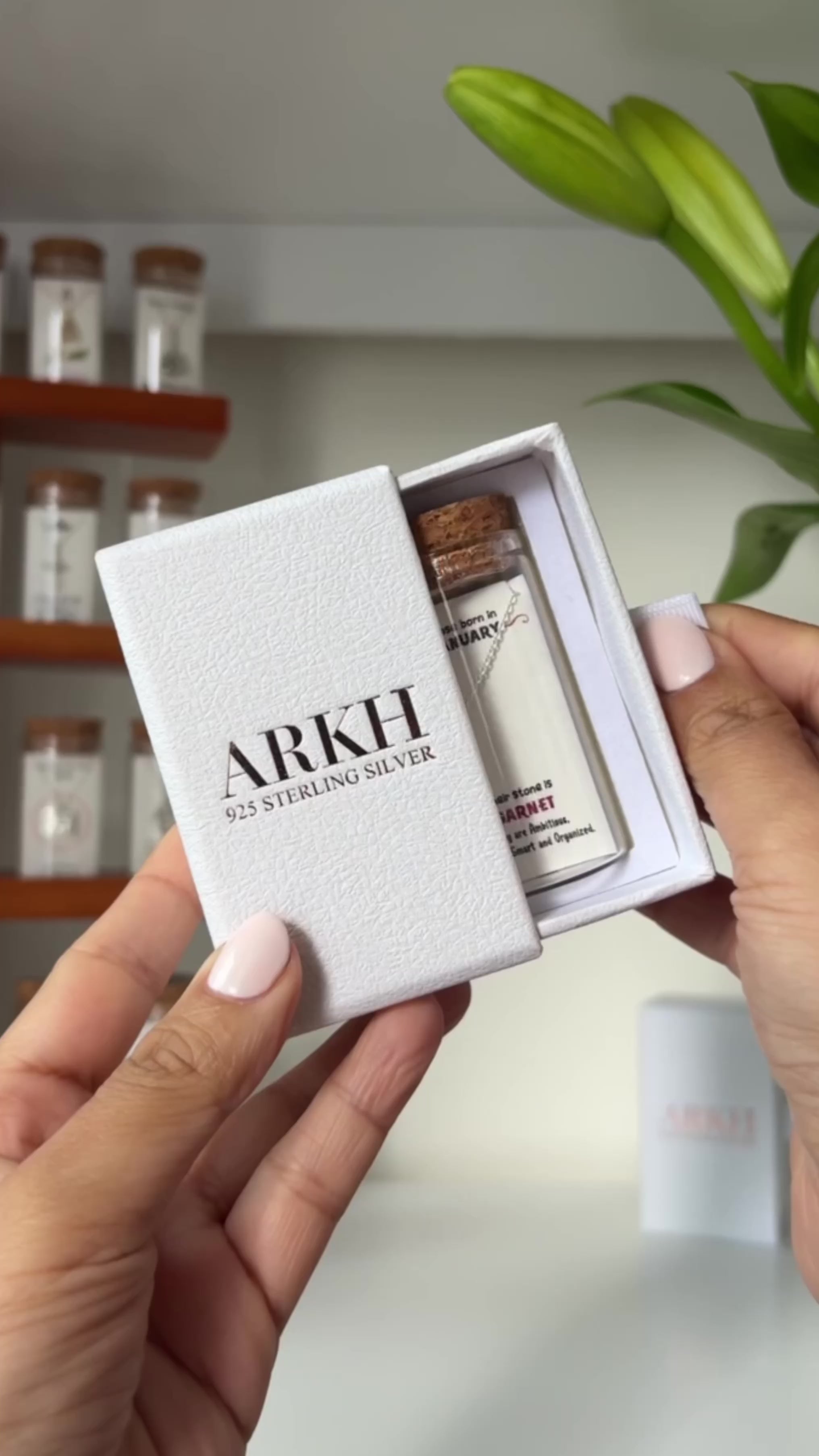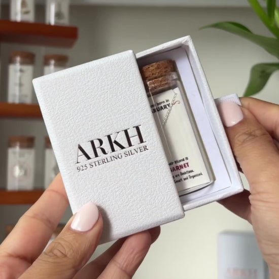 925 sterling silver necklace presented as a message-in-a-bottle. The January card reads "Those born in January — Their stone is GARNET. They are Ambitious, Serious, Smart and Organized” and features an original illustrated design. Delivered as a complete keepsake set of bottle, card, and jewellery.
