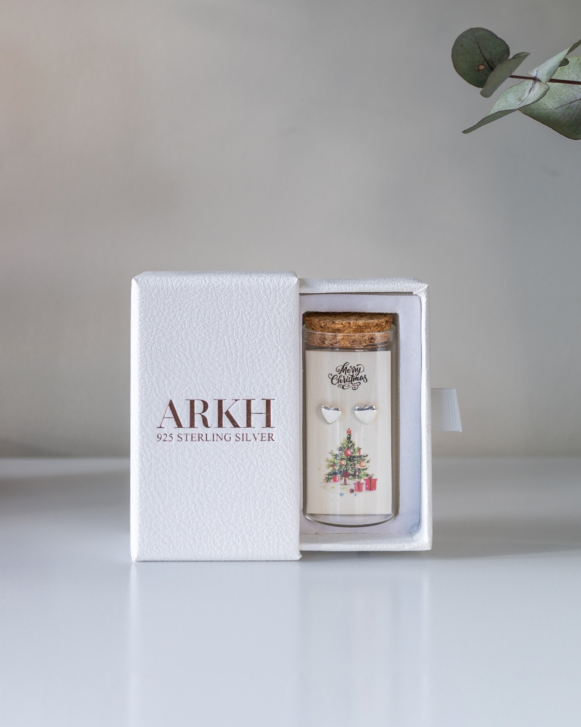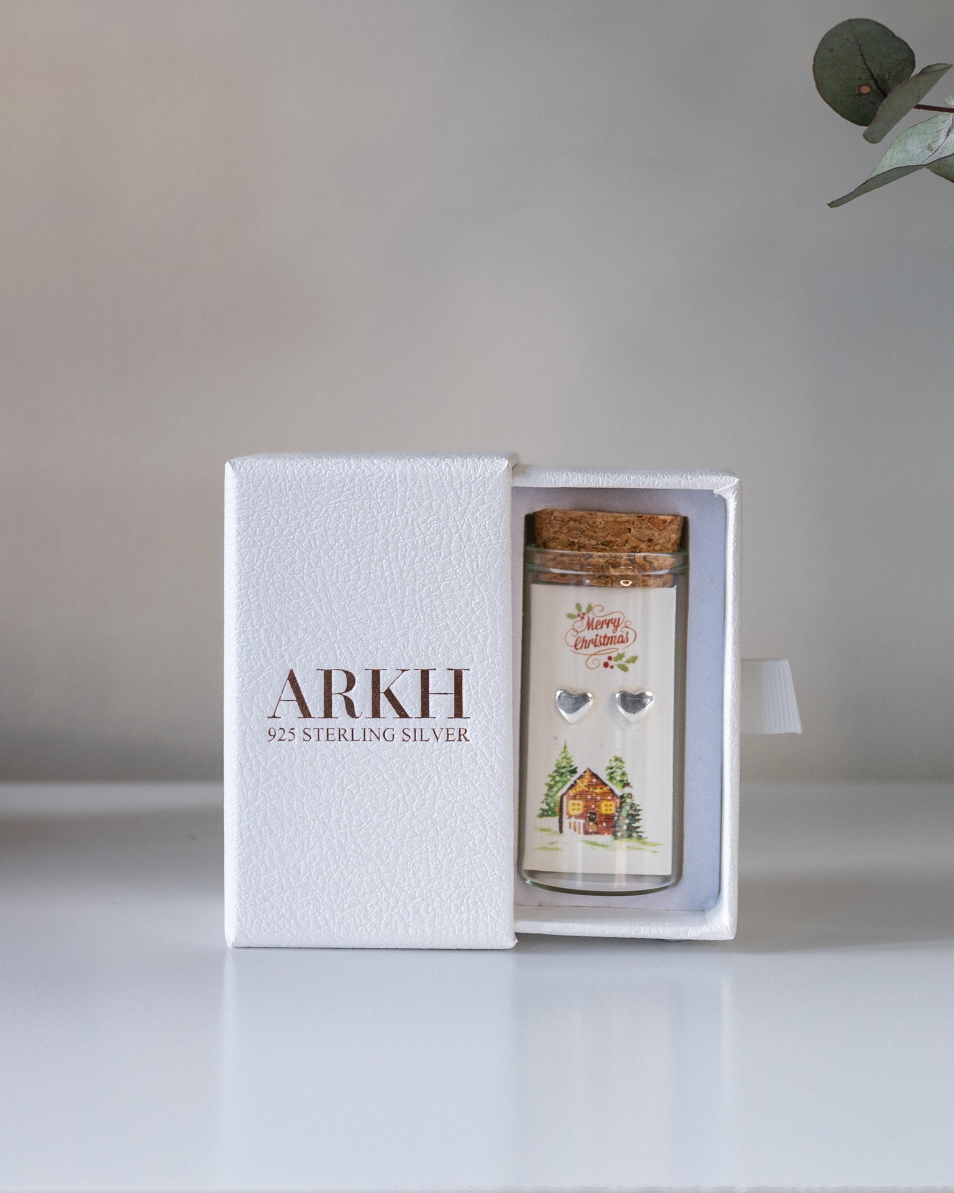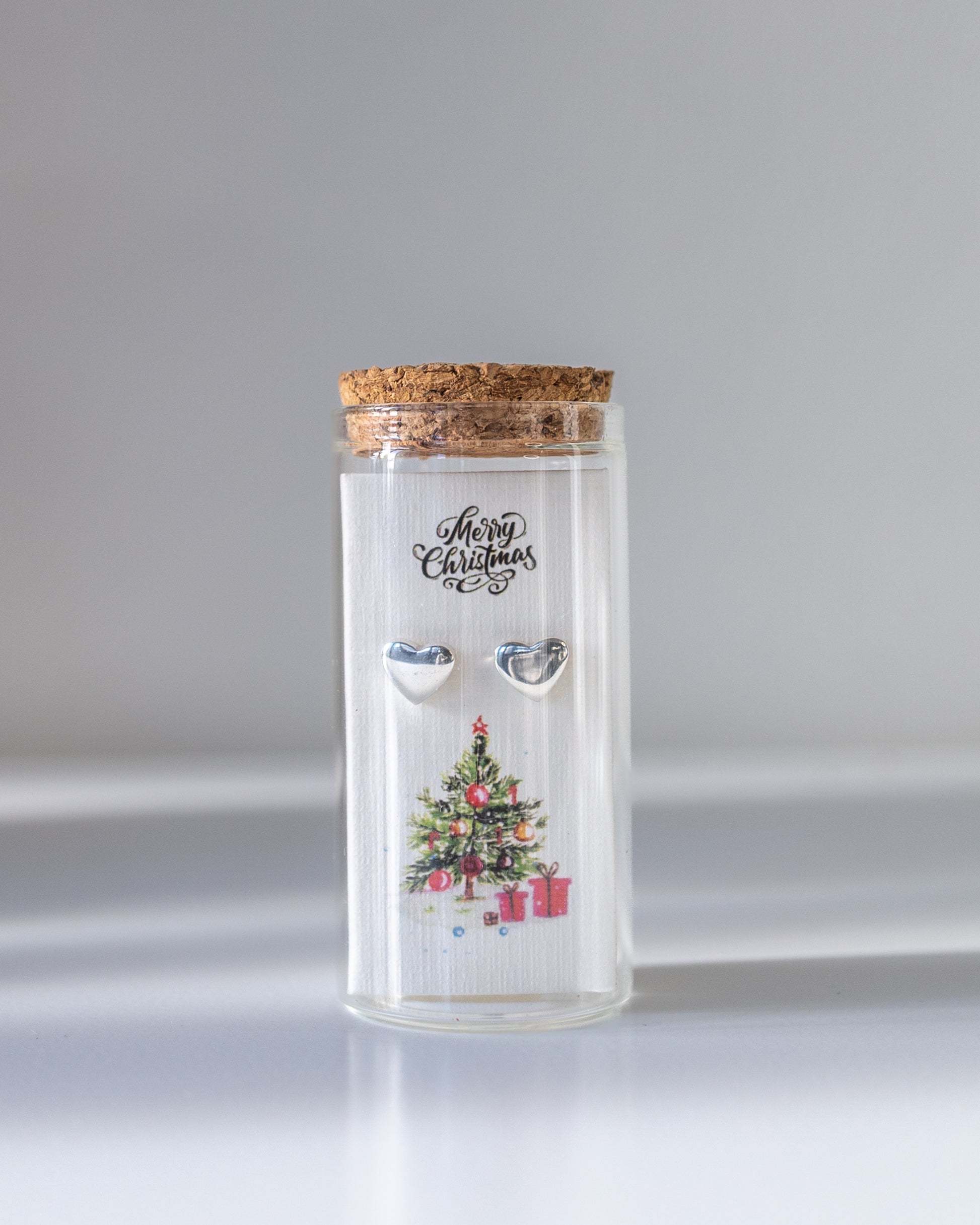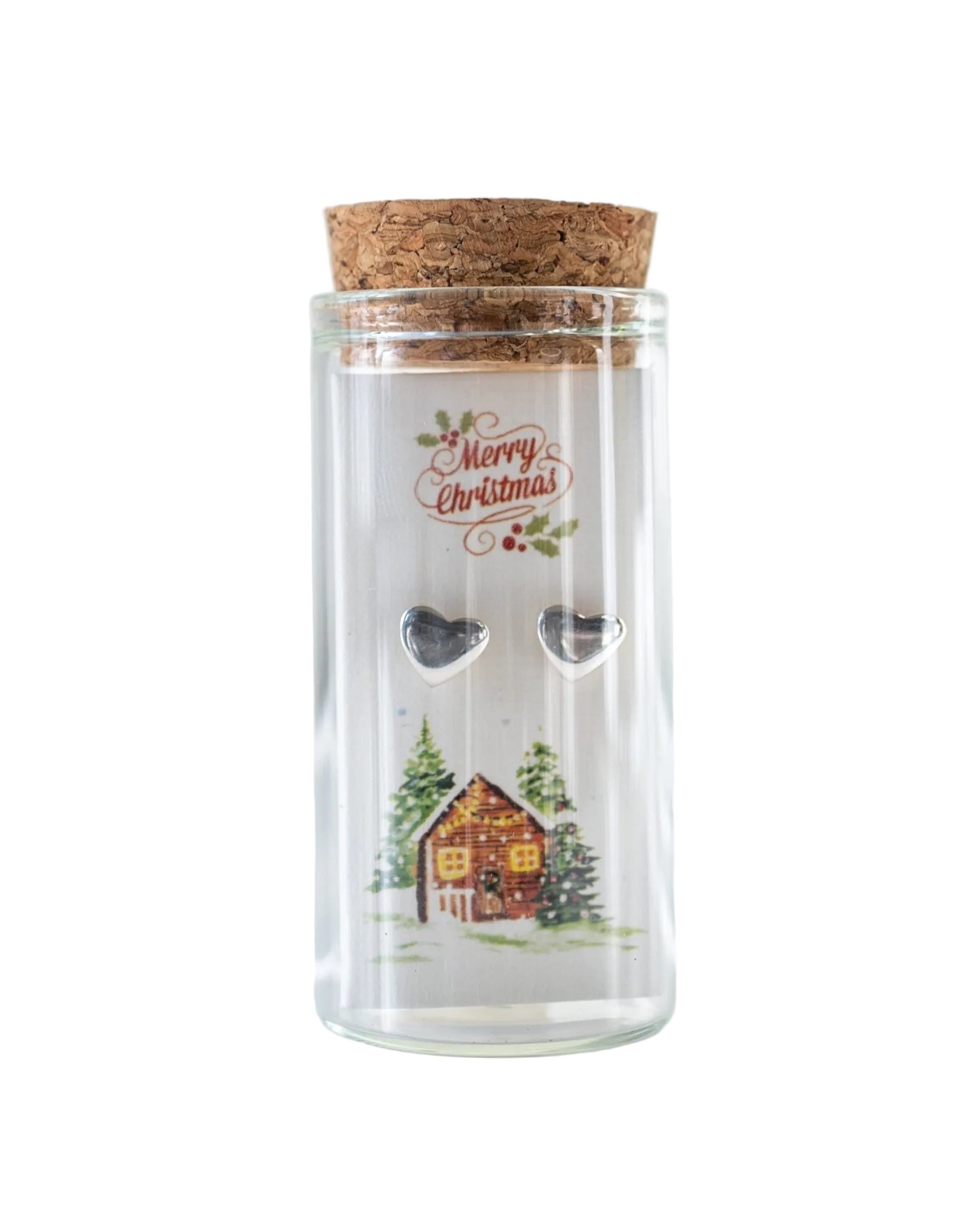 925 sterling silver studs presented as a message-in-a-bottle. The card reads "Merry Christmas" and features an original illustrated design. Delivered as a complete keepsake set of bottle, card, and jewellery.