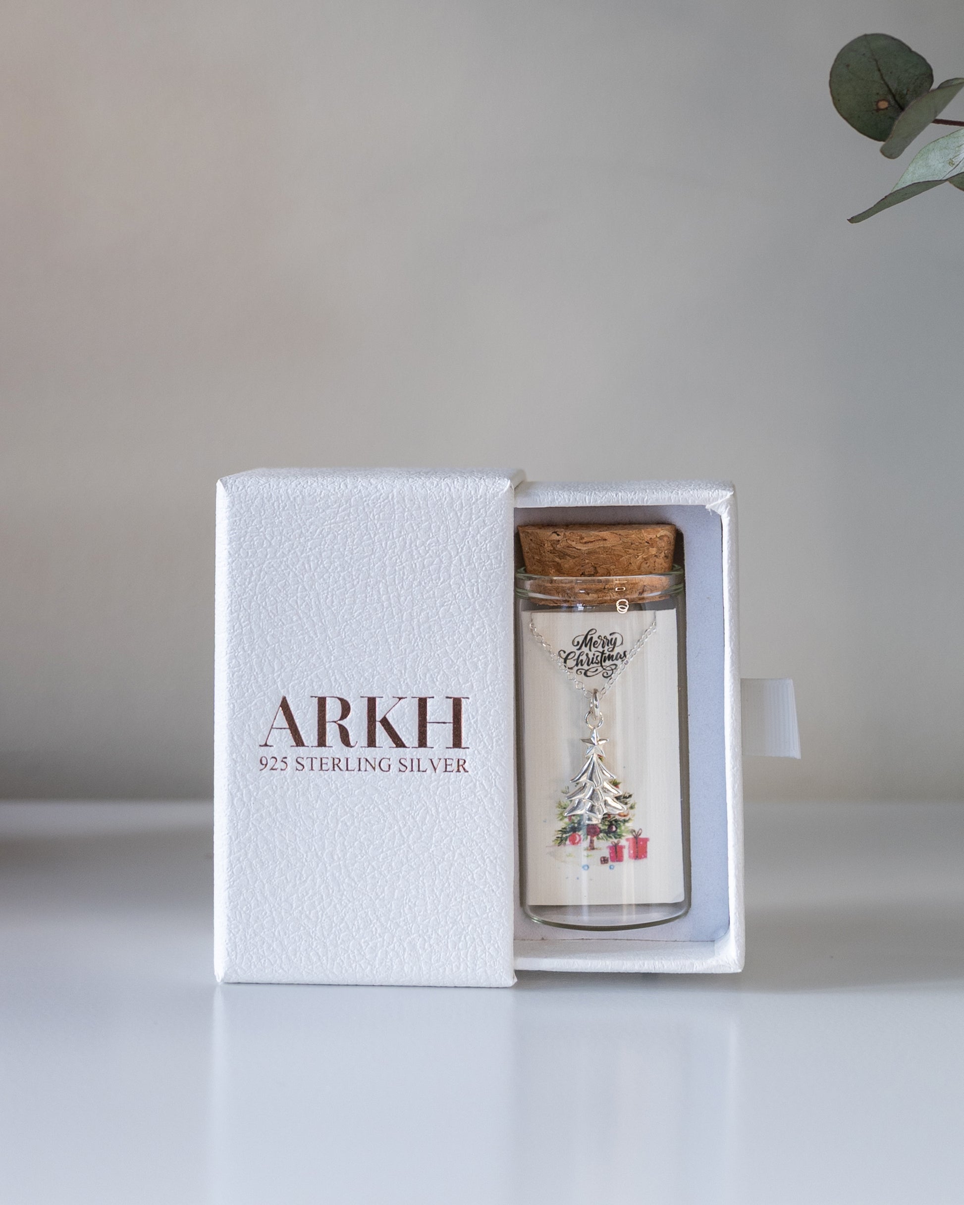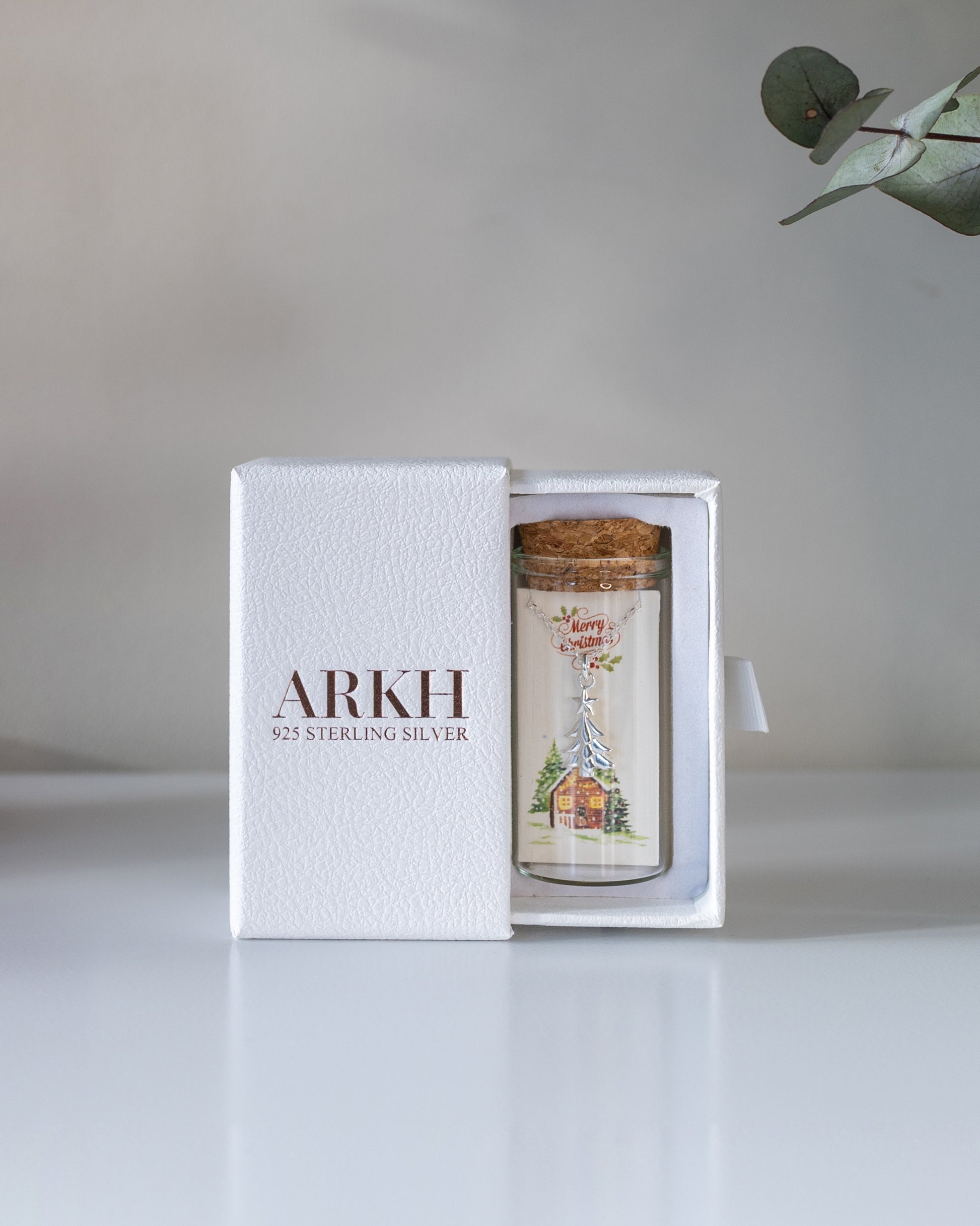 925 sterling silver necklace presented as a message-in-a-bottle. The card reads "Merry Christmas" and features an original illustrated design. Delivered as a complete keepsake set of bottle, card, and jewellery.