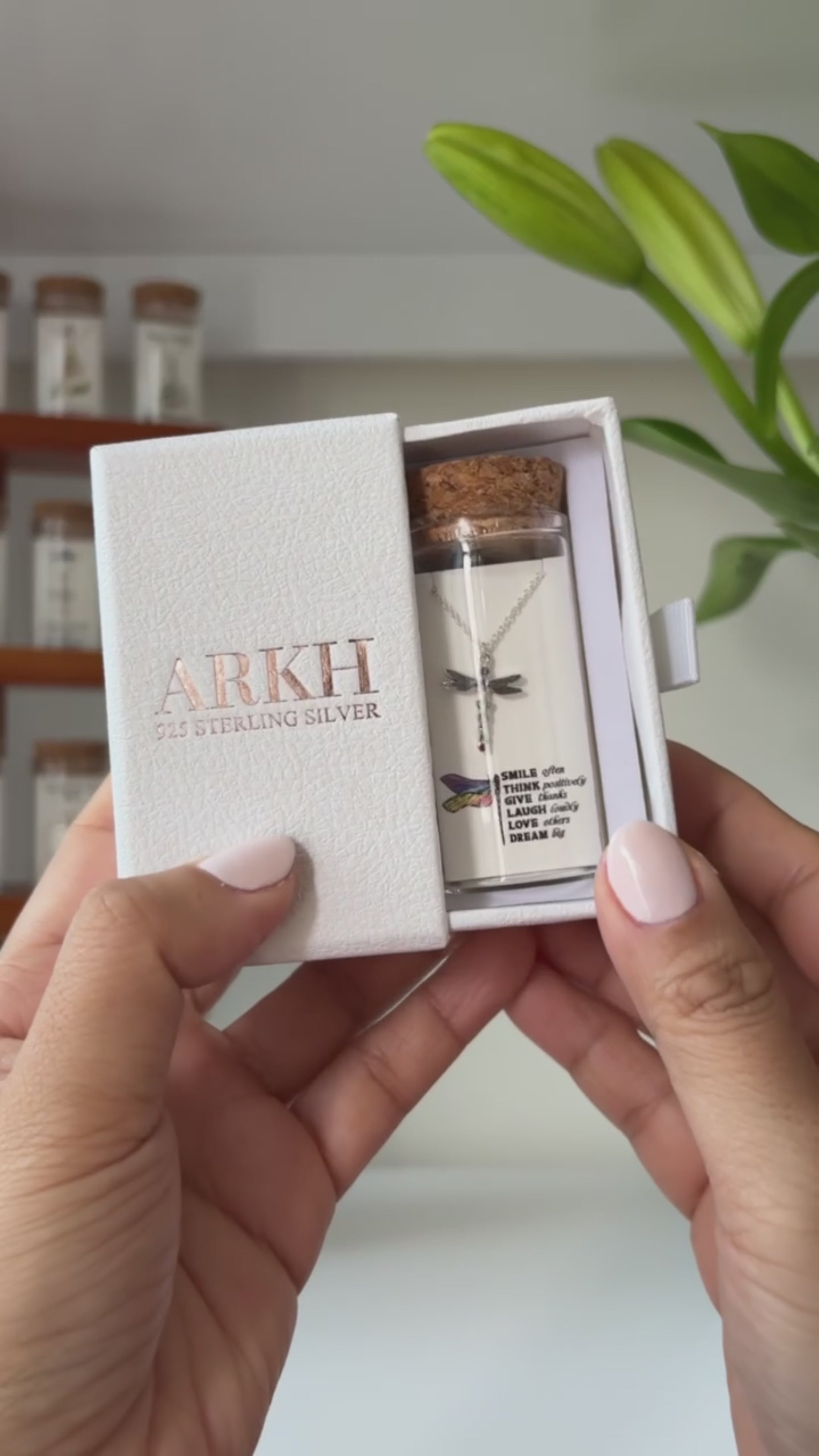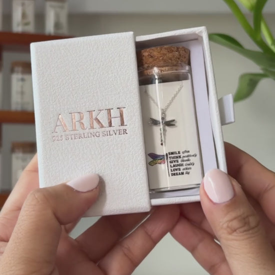 925 sterling silver necklace presented as a message-in-a-bottle. The card reads "Smile often, Think positively, Give thanks, Laugh loudly, Love others, Dream big" and features an original illustrated design. Delivered as a complete keepsake set of bottle, card, and jewellery.