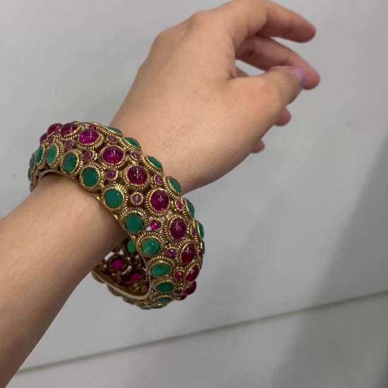 Gold Polished Green & Pink stones Bangle | 925 Sterling Silver | 126.85g