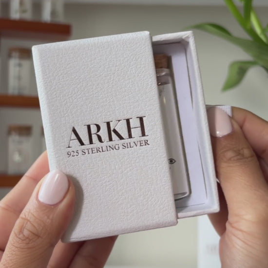 925 sterling silver necklace presented as a message-in-a-bottle. The card reads "May every Evil Eye in your life go blind" and features an original illustrated design. Delivered as a complete keepsake set of bottle, card, and jewellery.