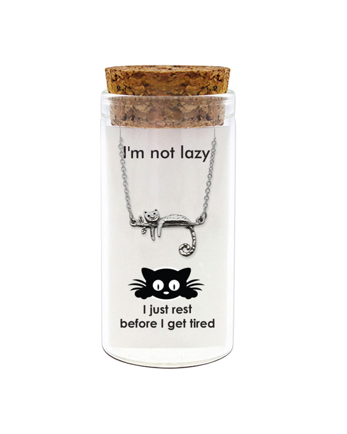 925 sterling silver necklace presented as a message-in-a-bottle. The card reads "I'm not lazy — I just rest before i get tired" and features an original illustrated design. Delivered as a complete keepsake set of bottle, card, and jewellery.