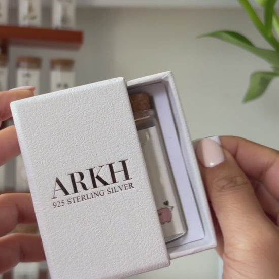925 sterling silver necklace presented as a message-in-a-bottle. The card reads "Miss you pig time" and features an original illustrated design. Delivered as a complete keepsake set of bottle, card, and jewellery.