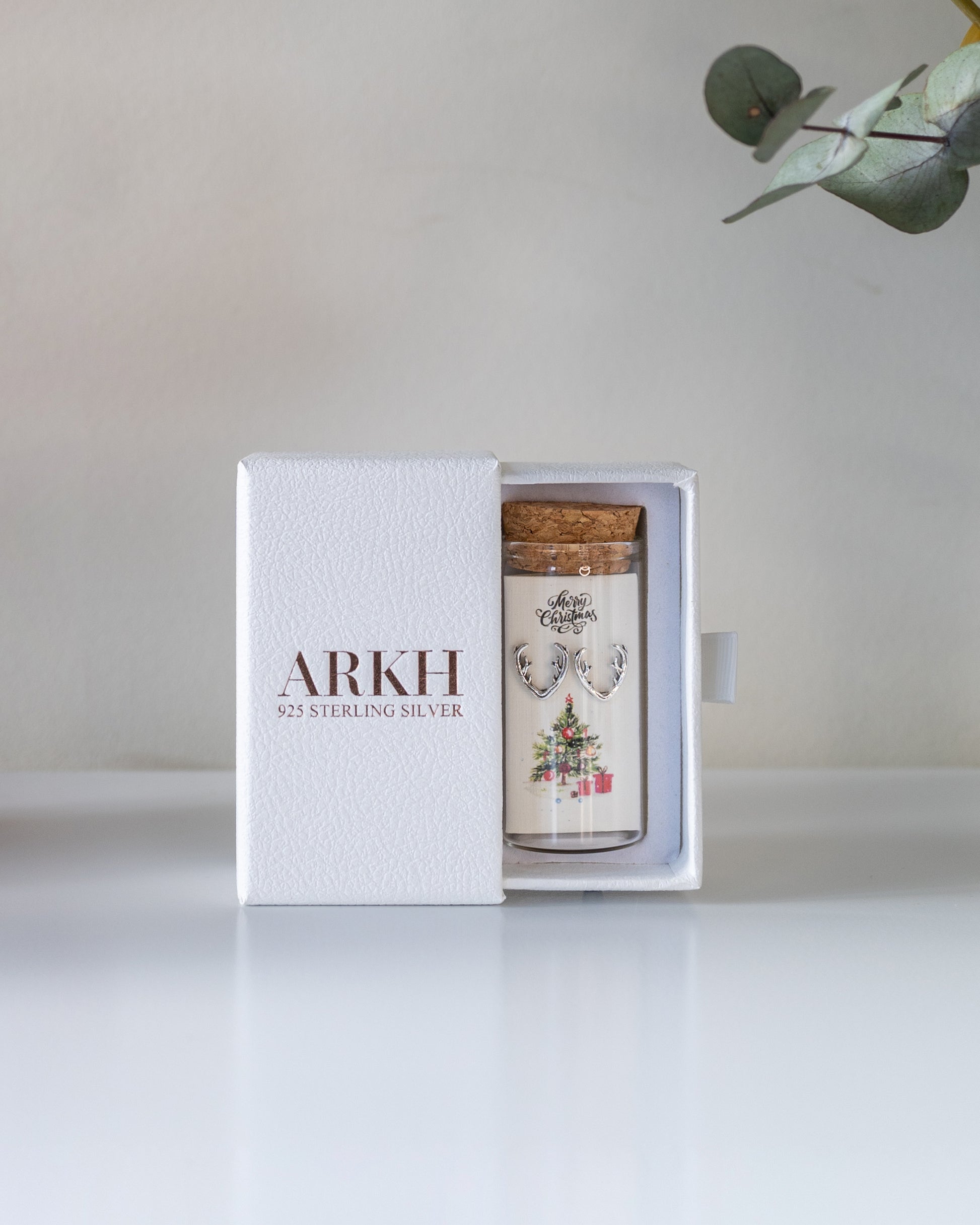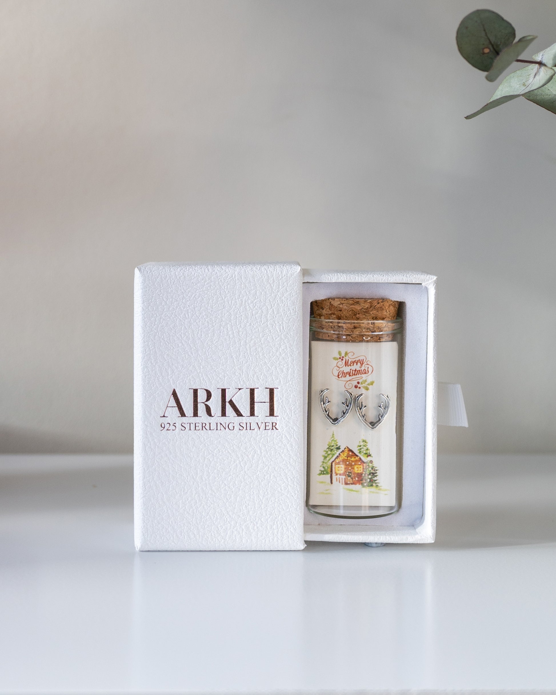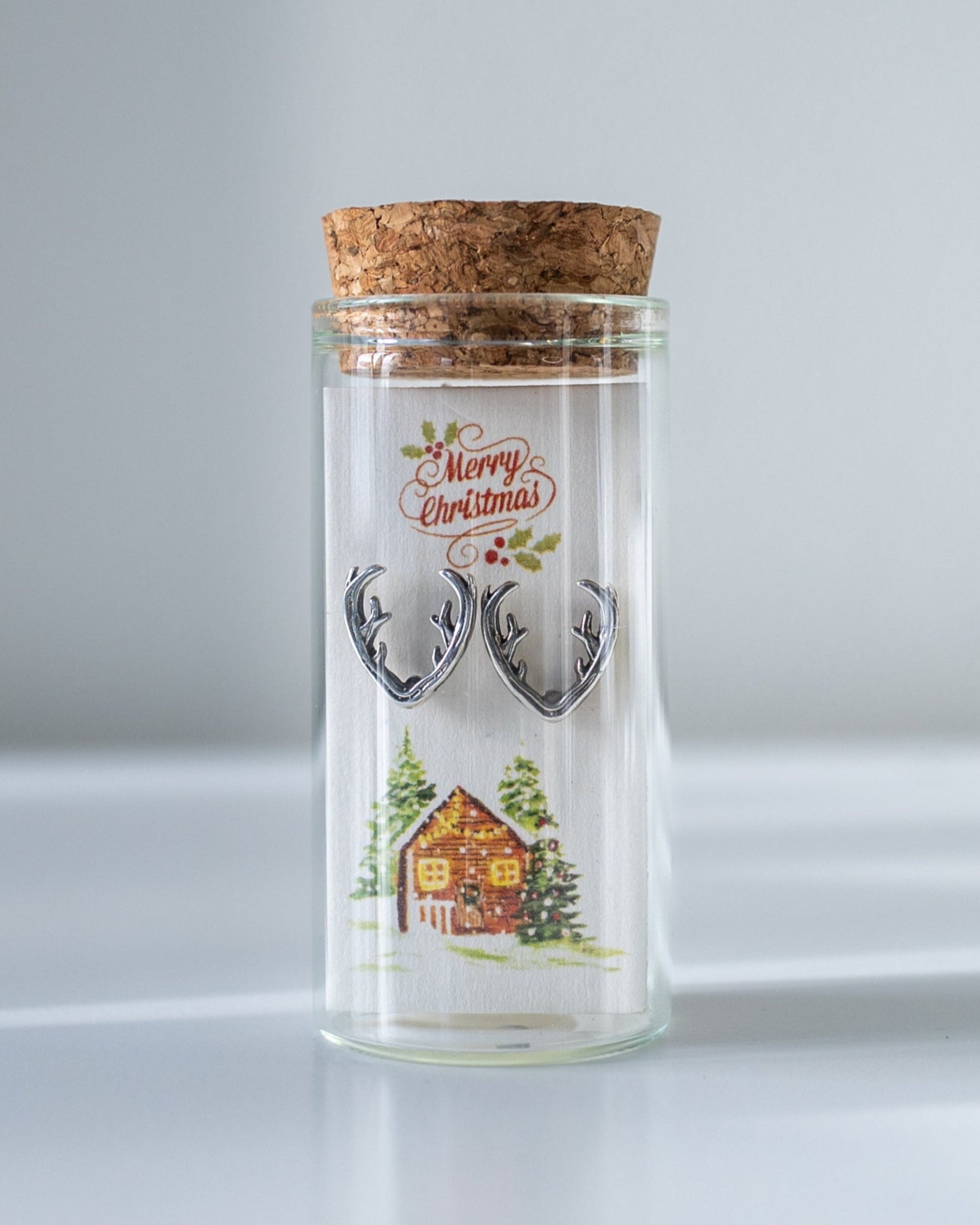 925 sterling silver studs presented as a message-in-a-bottle. The card reads "Merry Christmas" and features an original illustrated design. Delivered as a complete keepsake set of bottle, card, and jewellery.