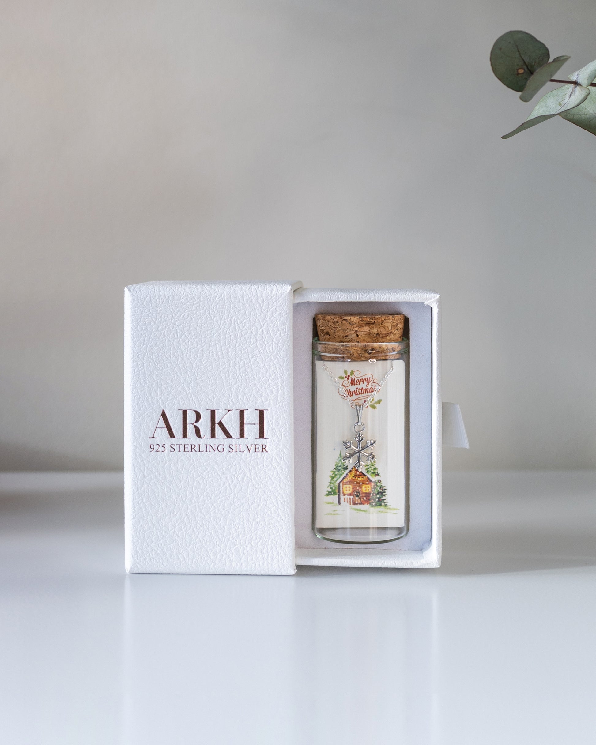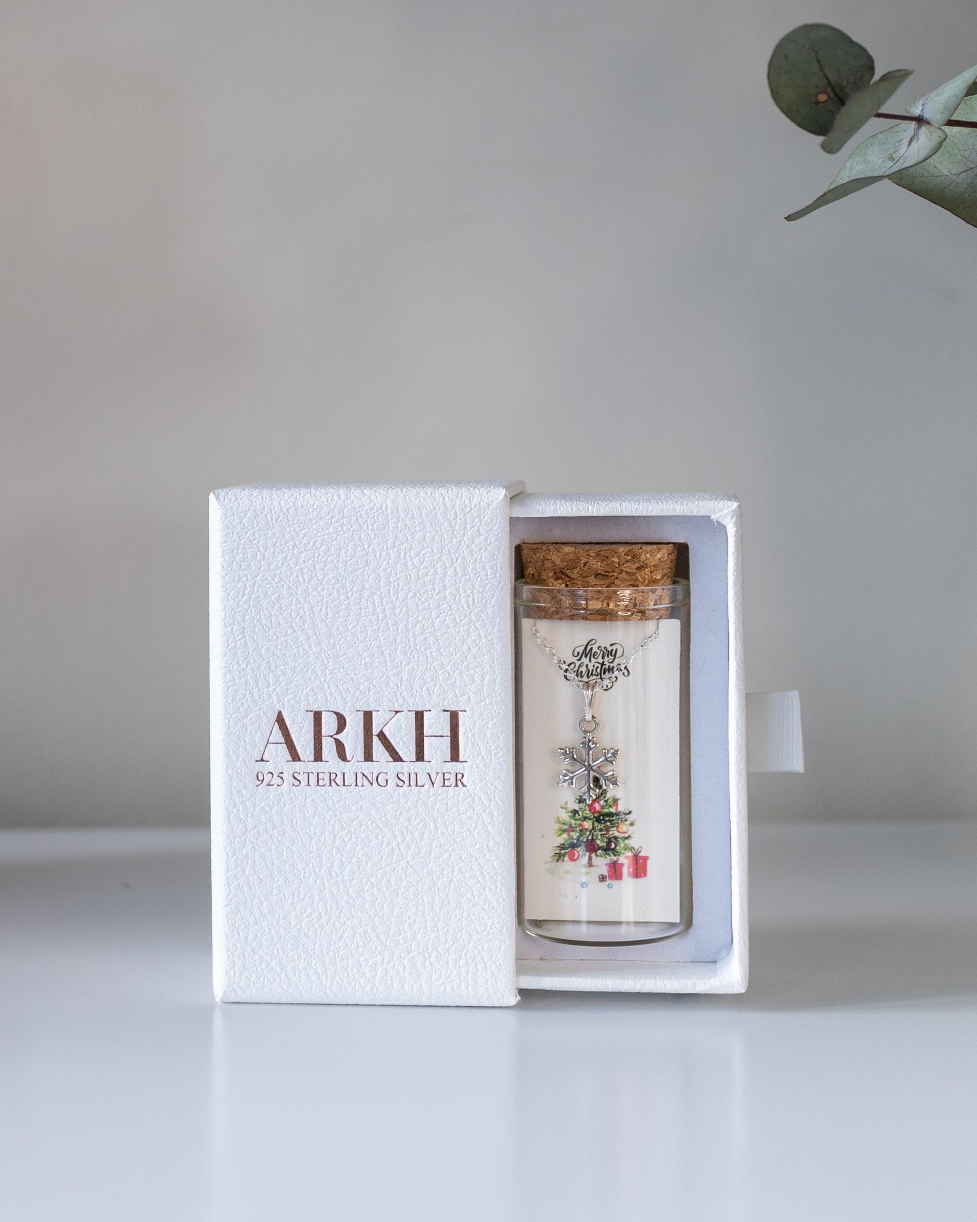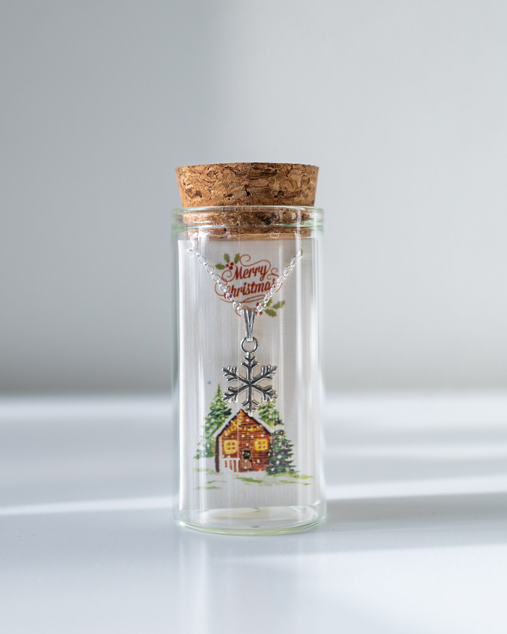 925 sterling silver necklace presented as a message-in-a-bottle. The card reads "Merry Christmas" and features an original illustrated design. Delivered as a complete keepsake set of bottle, card, and jewellery.