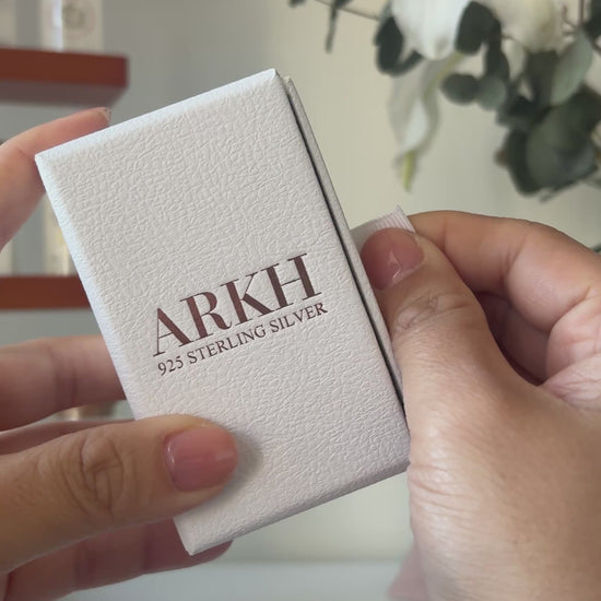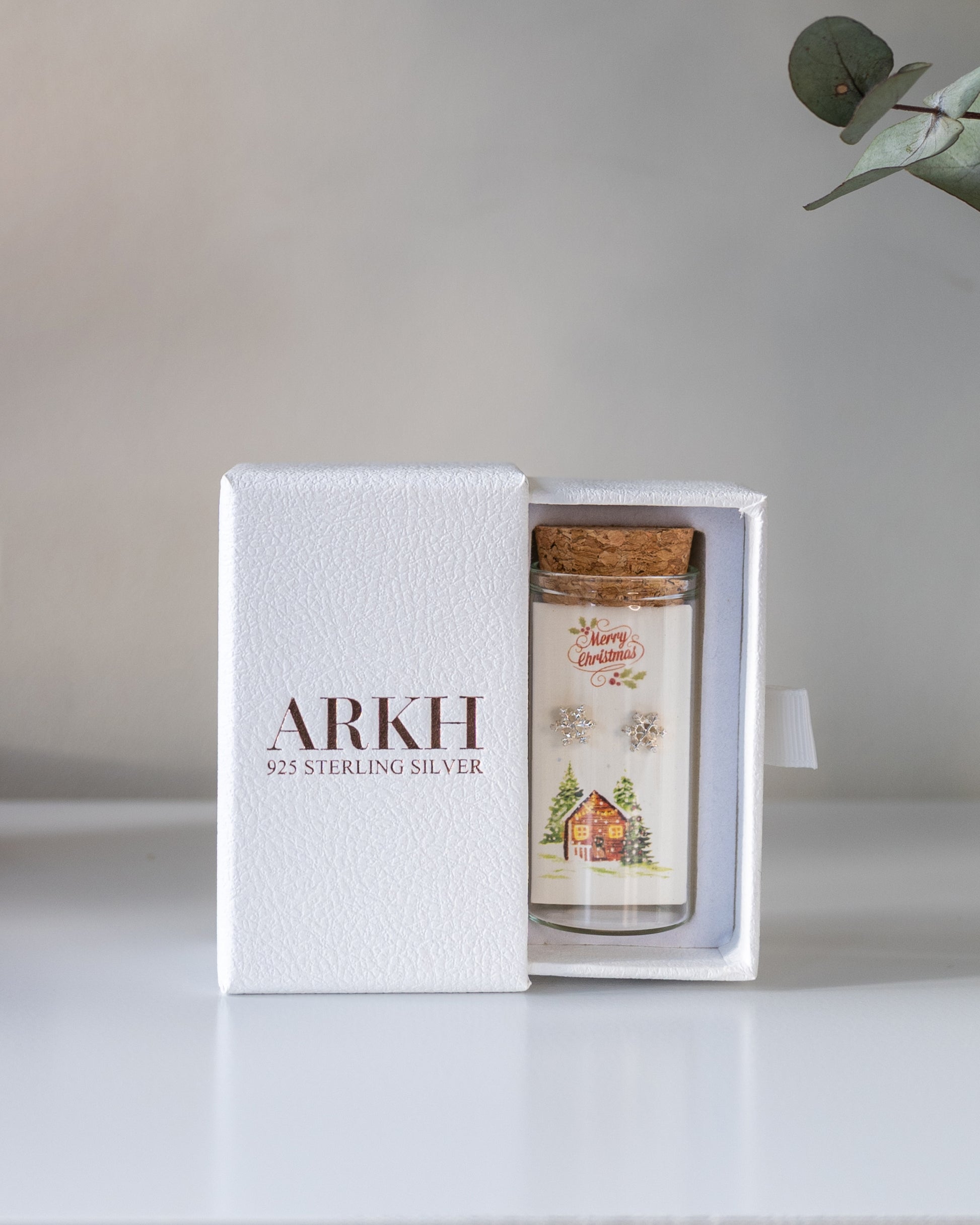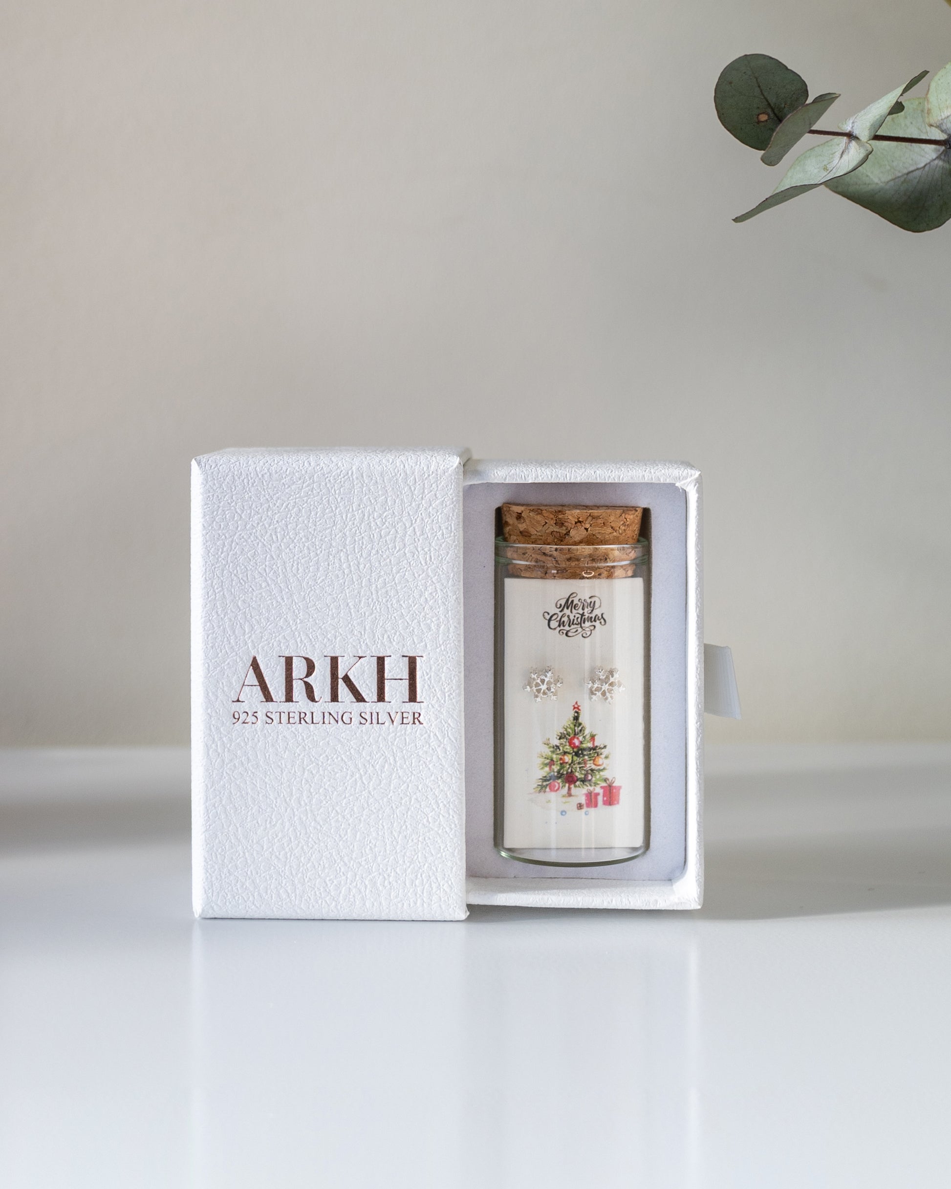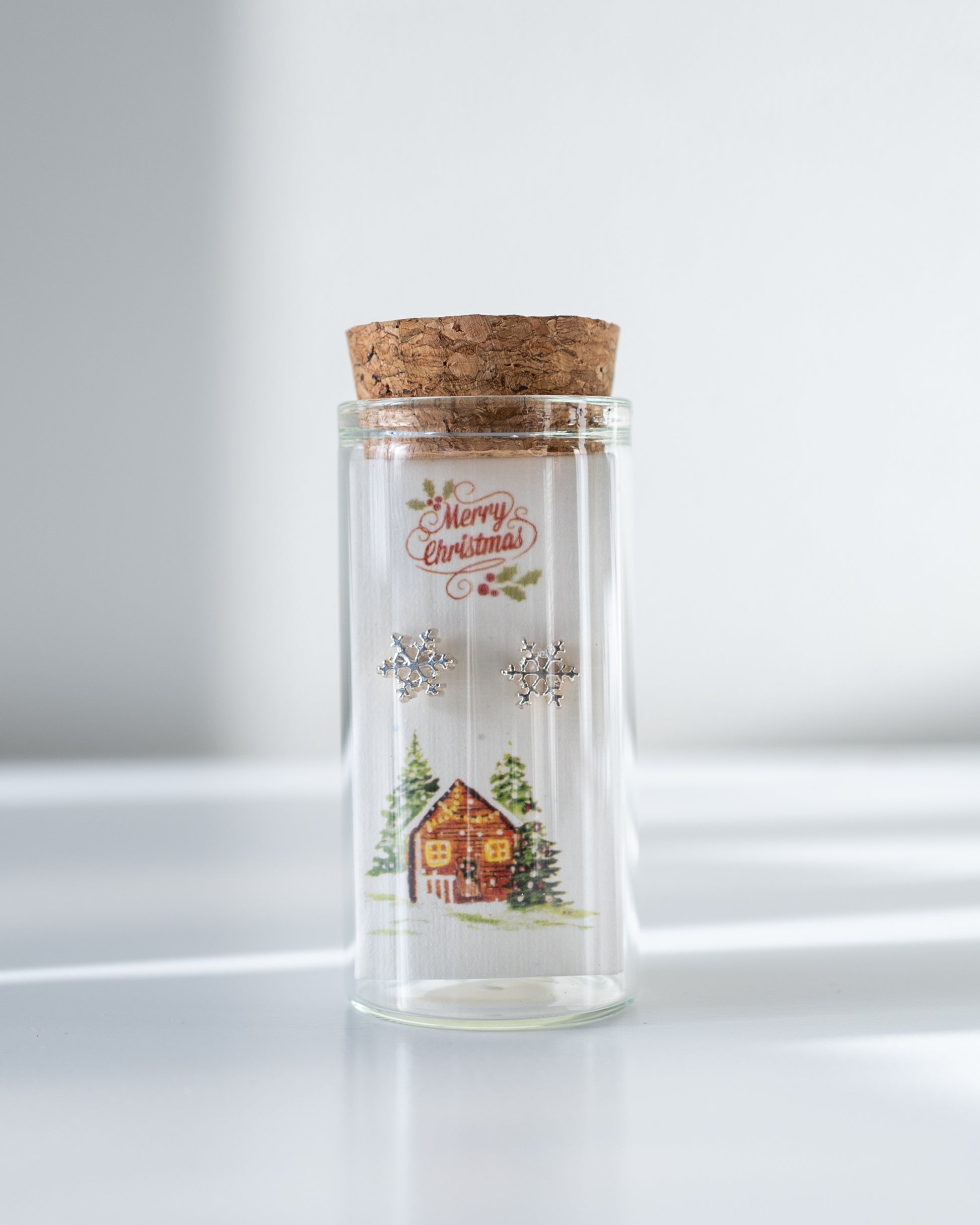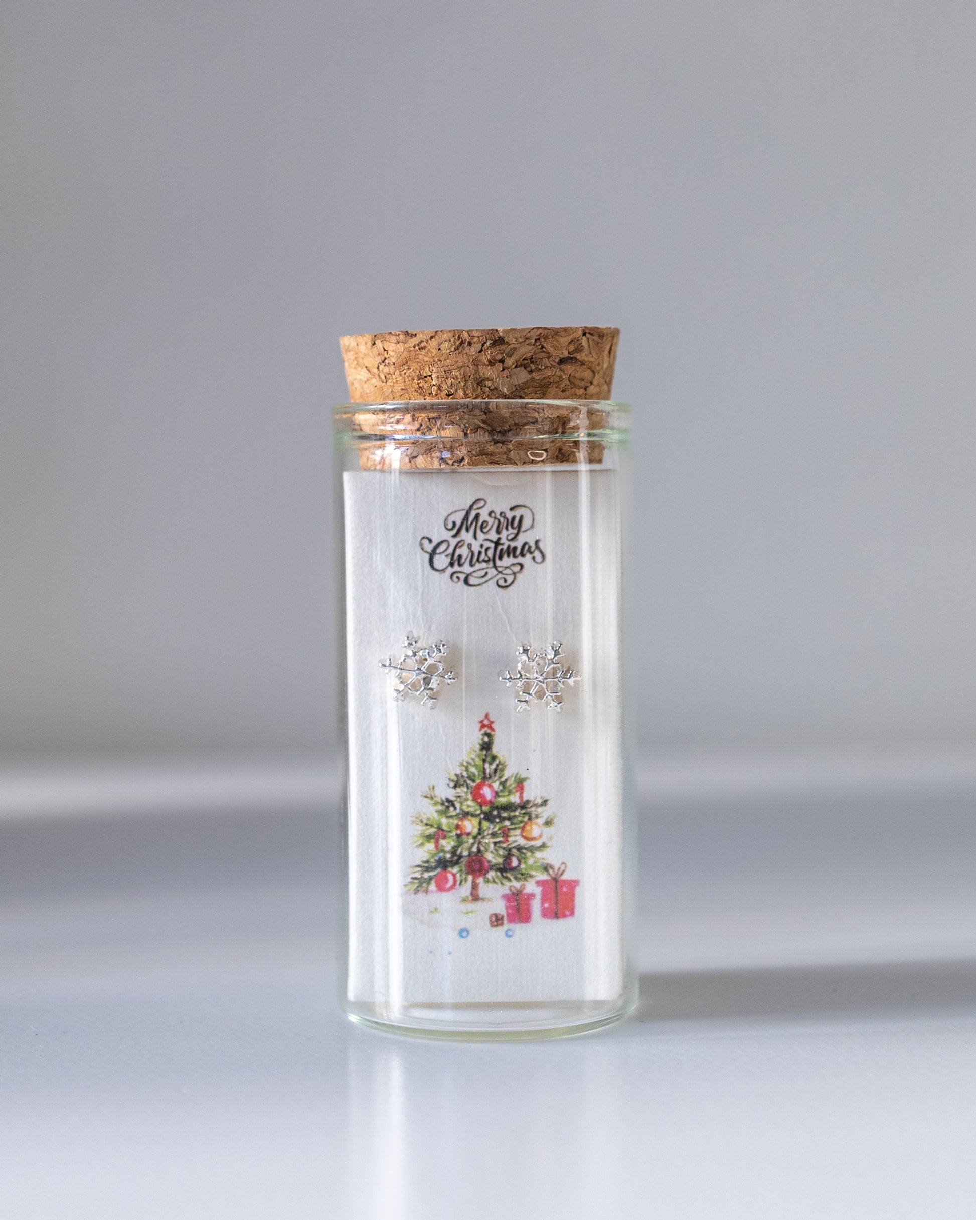 925 sterling silver studs presented as a message-in-a-bottle. The card reads "Merry Christmas" and features an original illustrated design. Delivered as a complete keepsake set of bottle, card, and jewellery.