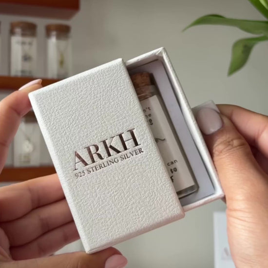 925 sterling silver studs presented as a message-in-a-bottle. The card reads "You can't stop the waves, but you can learn to surf" and features an original illustrated design. Delivered as a complete keepsake set of bottle, card, and jewellery.