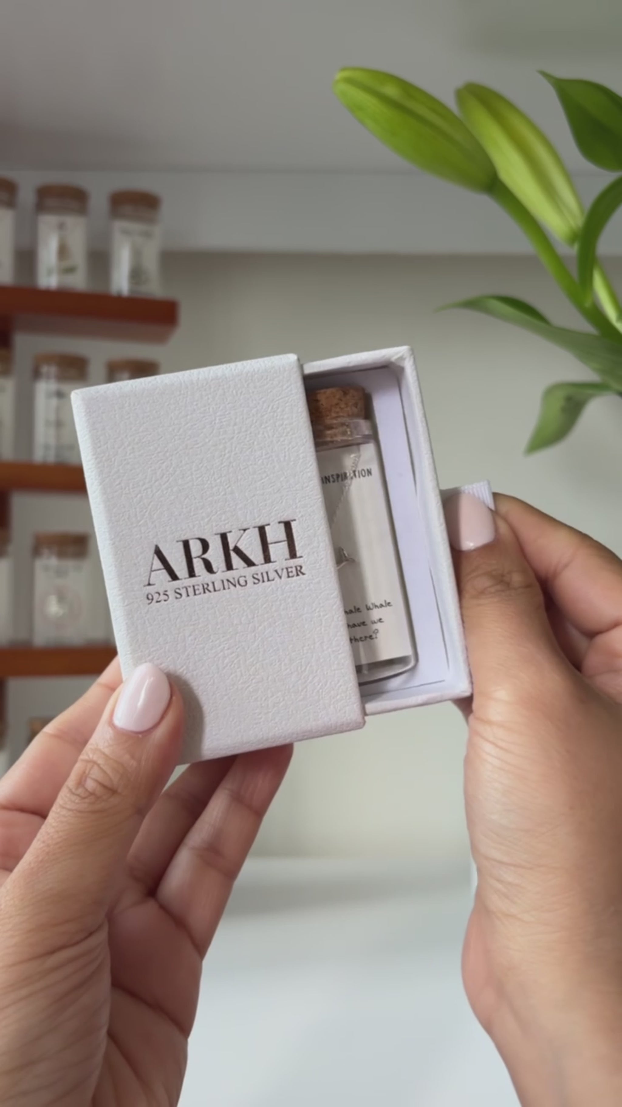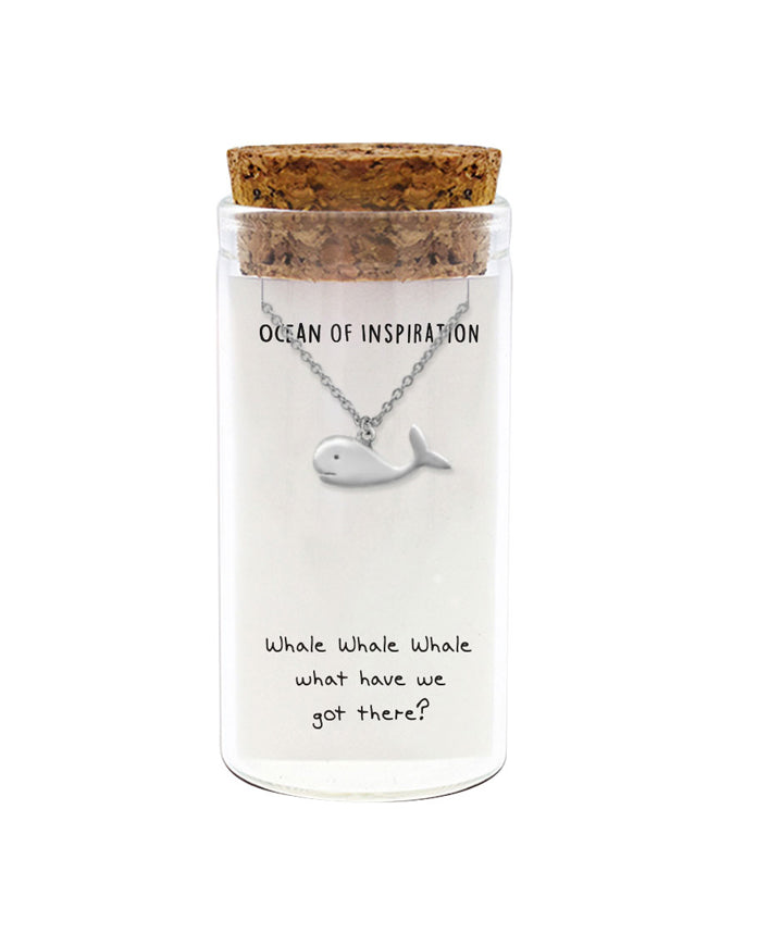 925 sterling silver necklace presented as a message-in-a-bottle. The card reads "Ocean of Inspiration — Whale Whale Whale, what have we got there?" and features an original illustrated design. Delivered as a complete keepsake set of bottle, card, and jewellery.