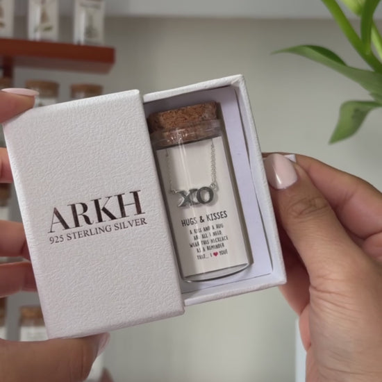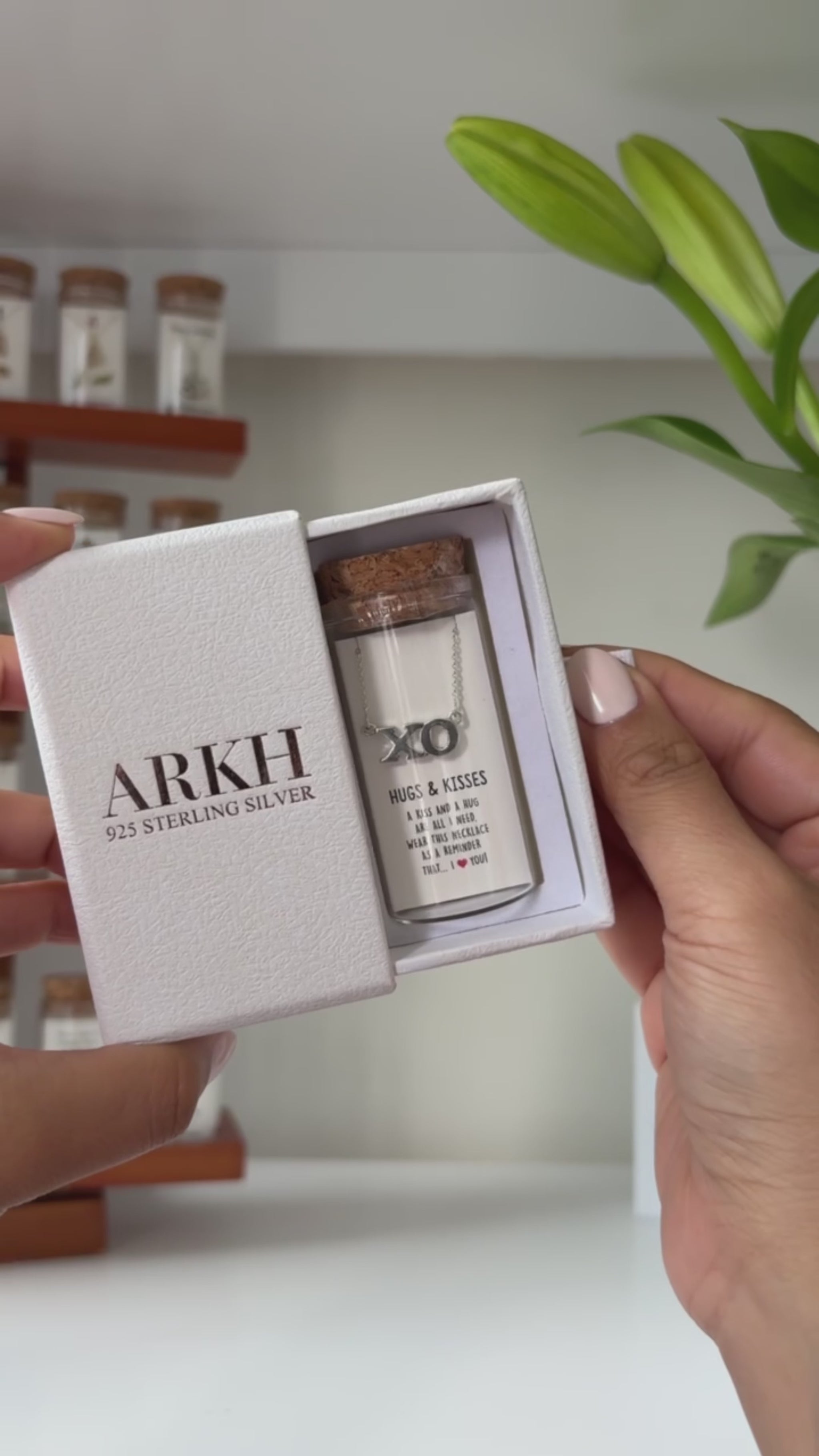 925 sterling silver necklace presented as a message-in-a-bottle. The card reads "Hugs & Kisses — A kiss and a hug are all i need. Wear the necklace as a reminder that... I Love You!" and features an original illustrated design. Delivered as a complete keepsake set of bottle, card, and jewellery.